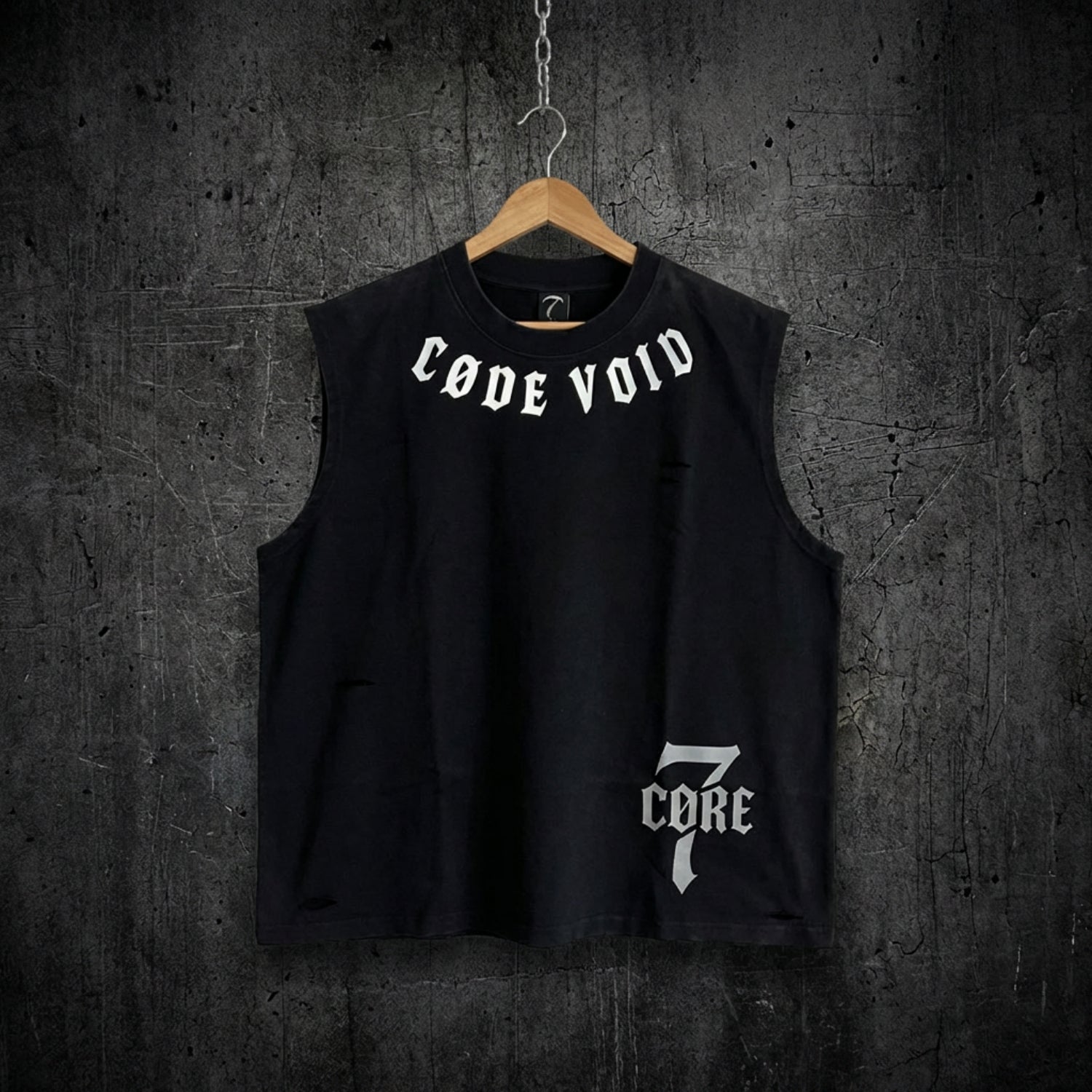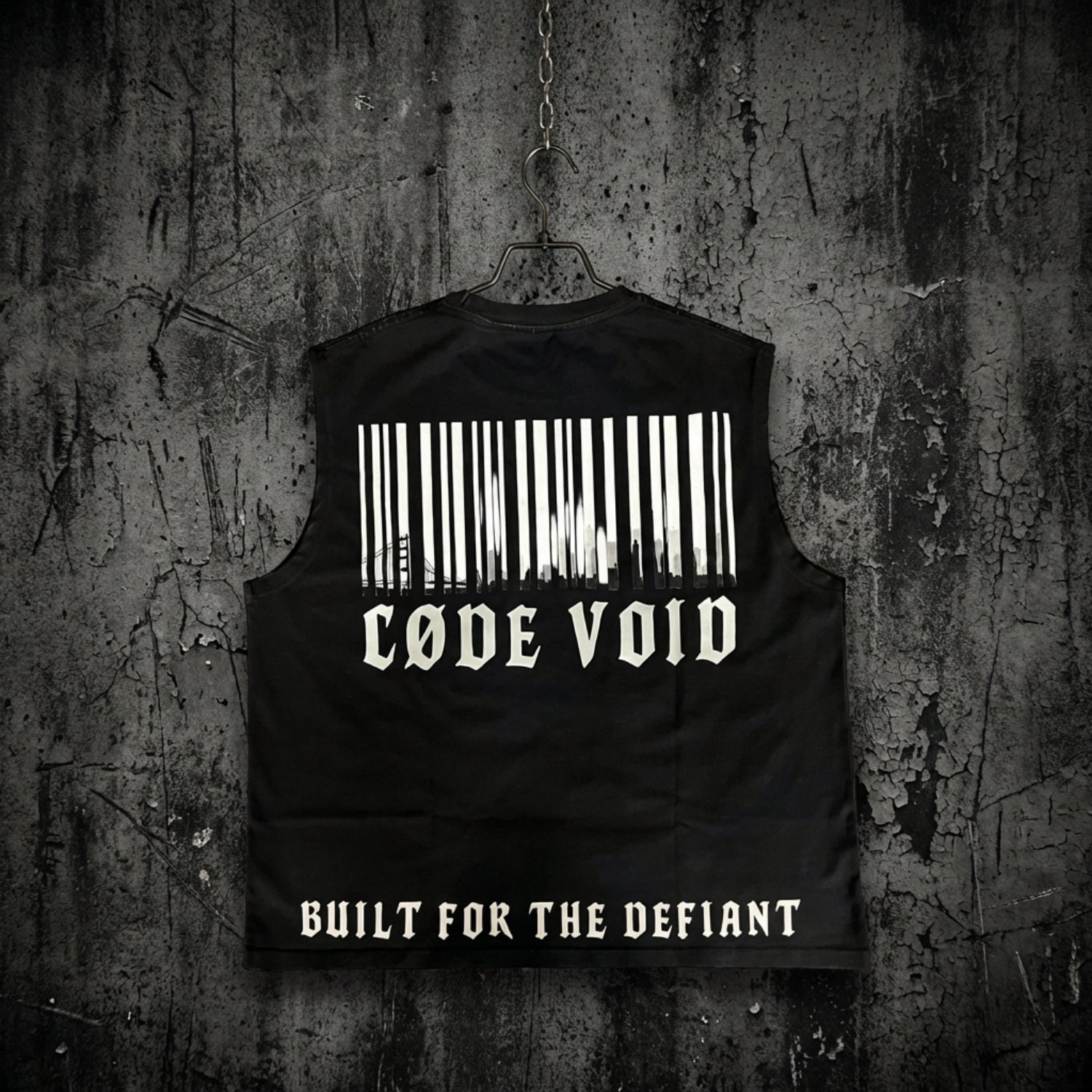 Washed black tank top made from soft cotton with a worn-in feel. Front features reflective “CØDE VOID” lettering across the collar and a reflective 7CØRE mark on the lower side. Back features a vertical reflective barcode skyline graphic with matching “CØDE VOID” and “BUILT FOR THE DEFIANT” text. Reflective prints stay low-key indoors and flare up under direct light. Relaxed cut with raw-style arm openings for a sharper street look.